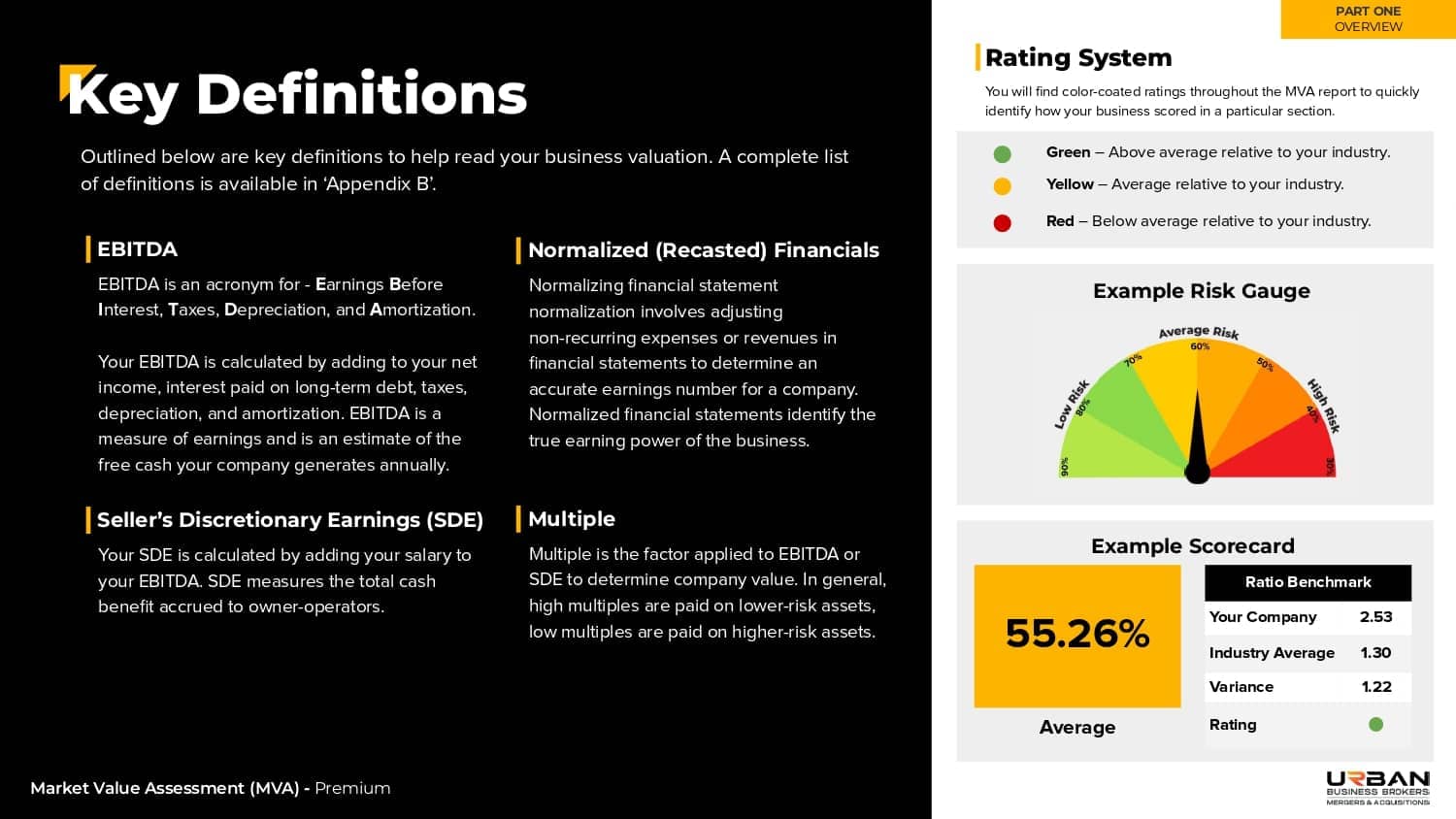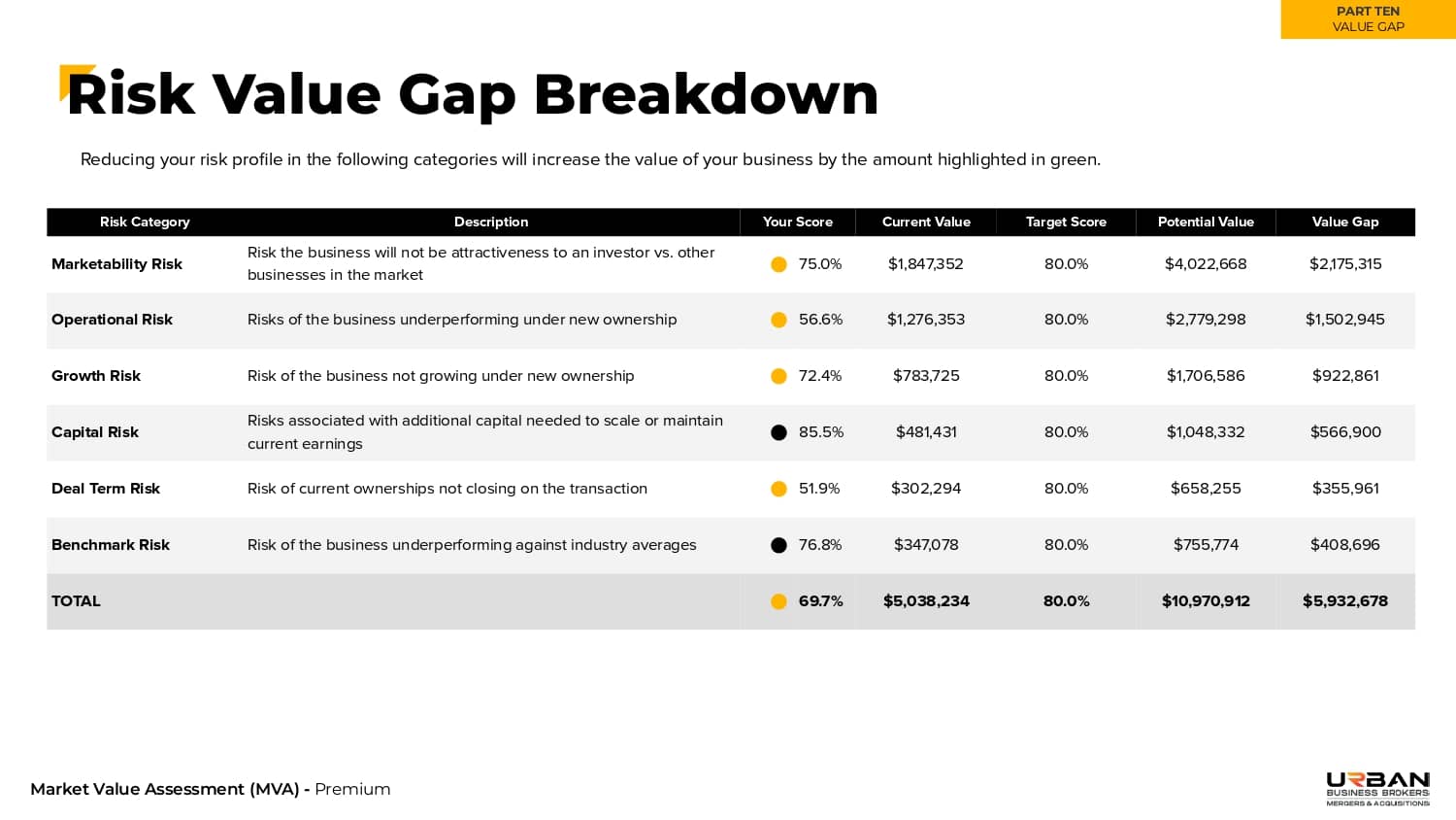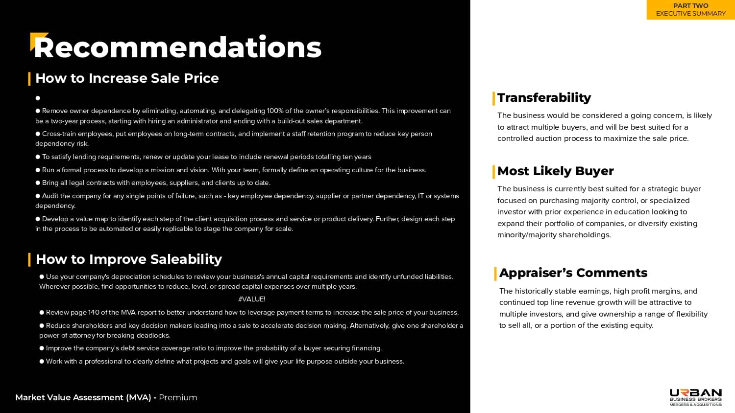 A summary of the key takeaways and recommendations – your company’s current value, risk profile, industry multiples, and recommendations for improving saleability and sale price.