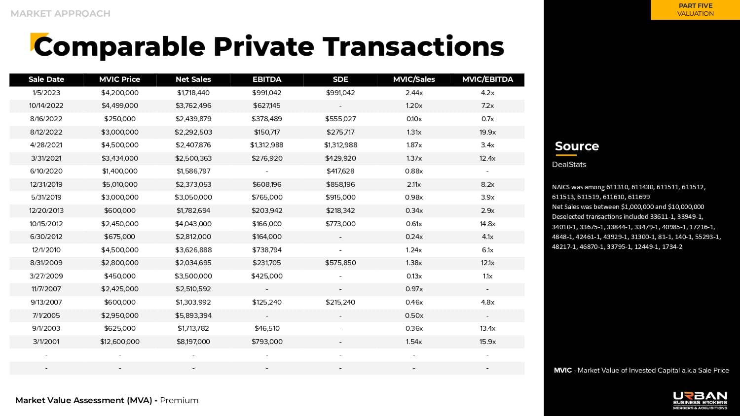 We have access to several recognized business databases with both historical/current data for sold and unsold businesses. This data helps us in understanding business trends and the value for which they are selling. There is much to a broker opinion of value than just the data available. As a matter fact analyzing comparable data is a last step in valuation there are many steps before reaching to this point like finding and calculating the annual discretionary earning, current assets, fair market value of assets and many more.