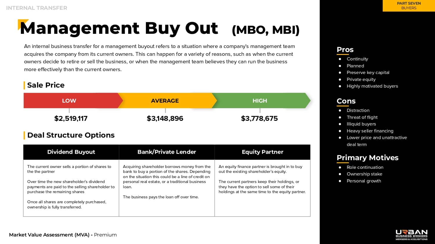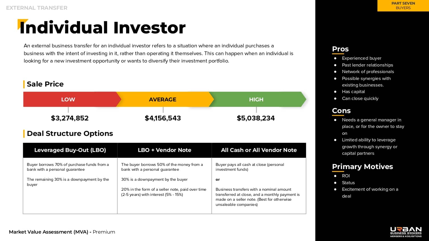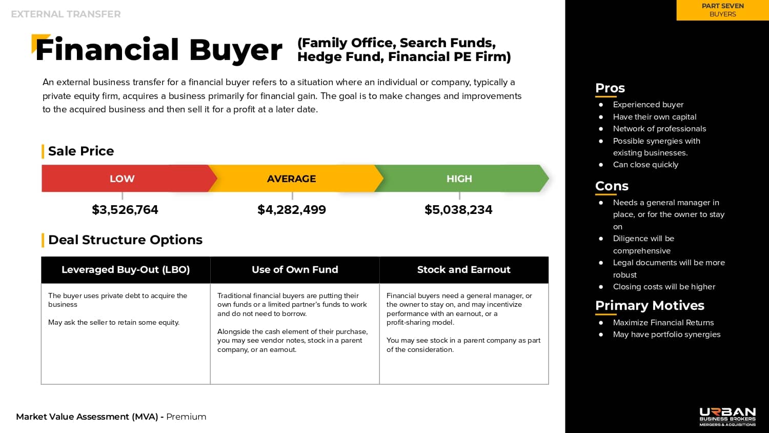 This section outlines twelve different types of buyers in the market, the pros and cons of each, how much they are likely to pay, and how they typically structure a purchase.