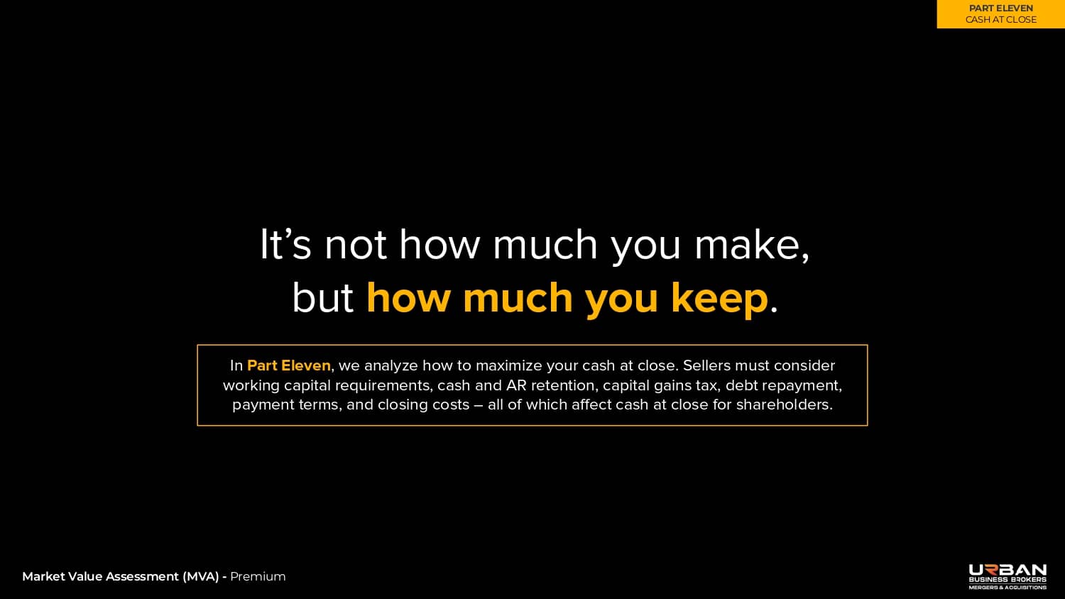 This section identifies how much cash shareholders will walk away with upon closing, after all transaction costs.